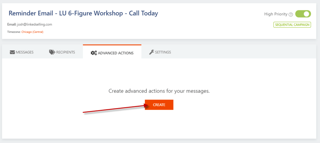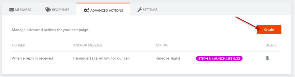 Save your Advanced Action. If you want to create an additional action in your campaign - click 'Create' to add additional advanced actions.