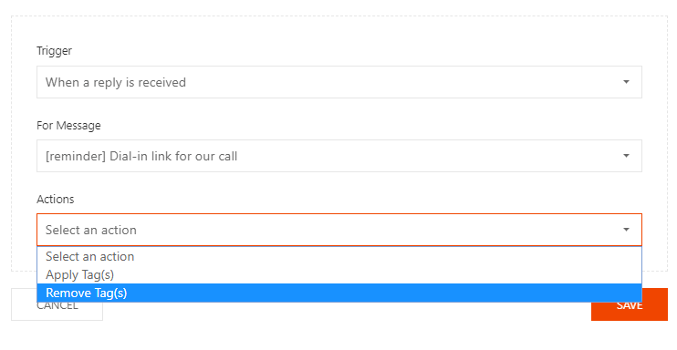 Choose the action taken. You can either send a message to the recipients who triggered the response, apply a new tag to those recipients, or remove specific tags.